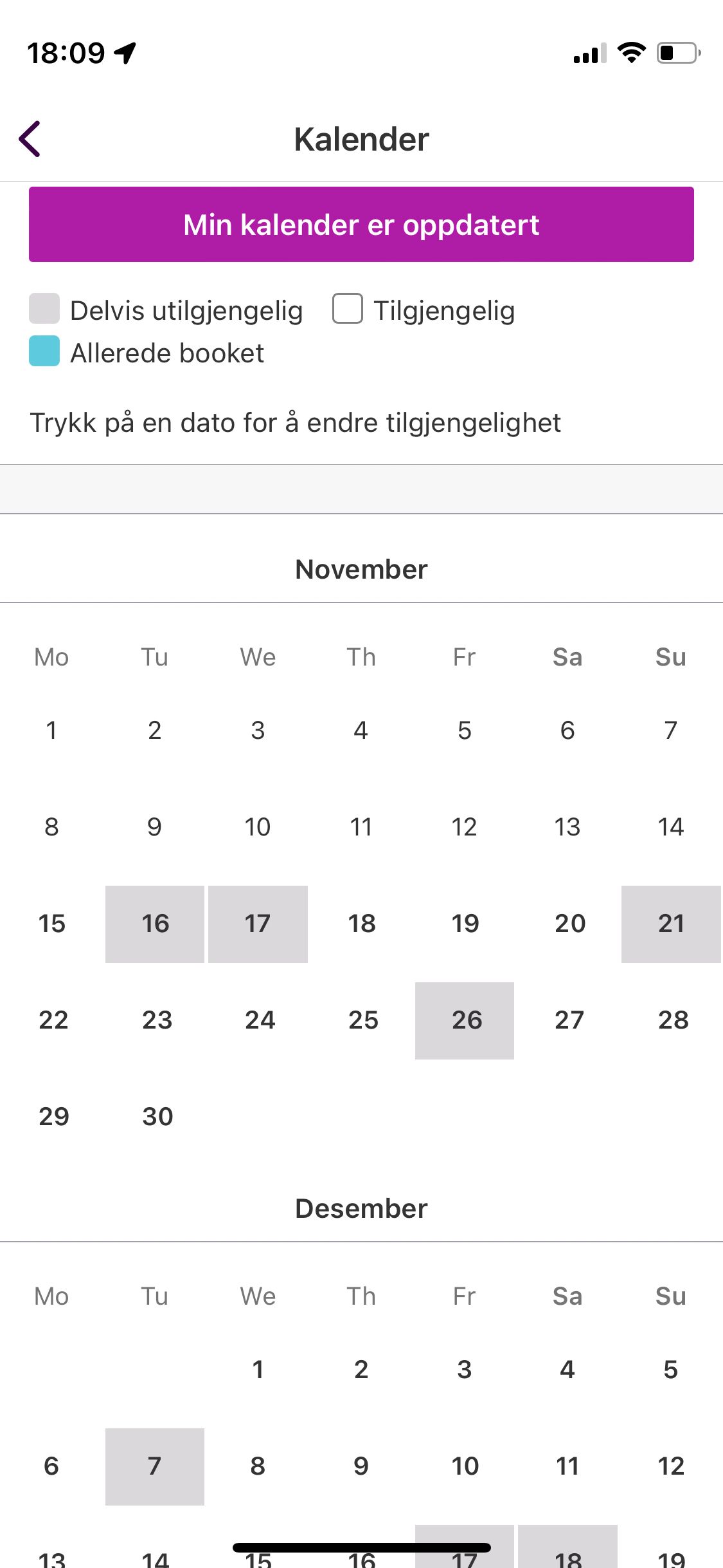 Hold kalenderen oppdatert for å sikre at bilen din faktisk er ledig mår du får bookinger. Er du usikker på om bilen din er tilgjengelig eller ikke en dag er det bedre å være på den sikre siden og markere den som utilgjengelig til du er 100% sikker på at den faktisk er ledig.