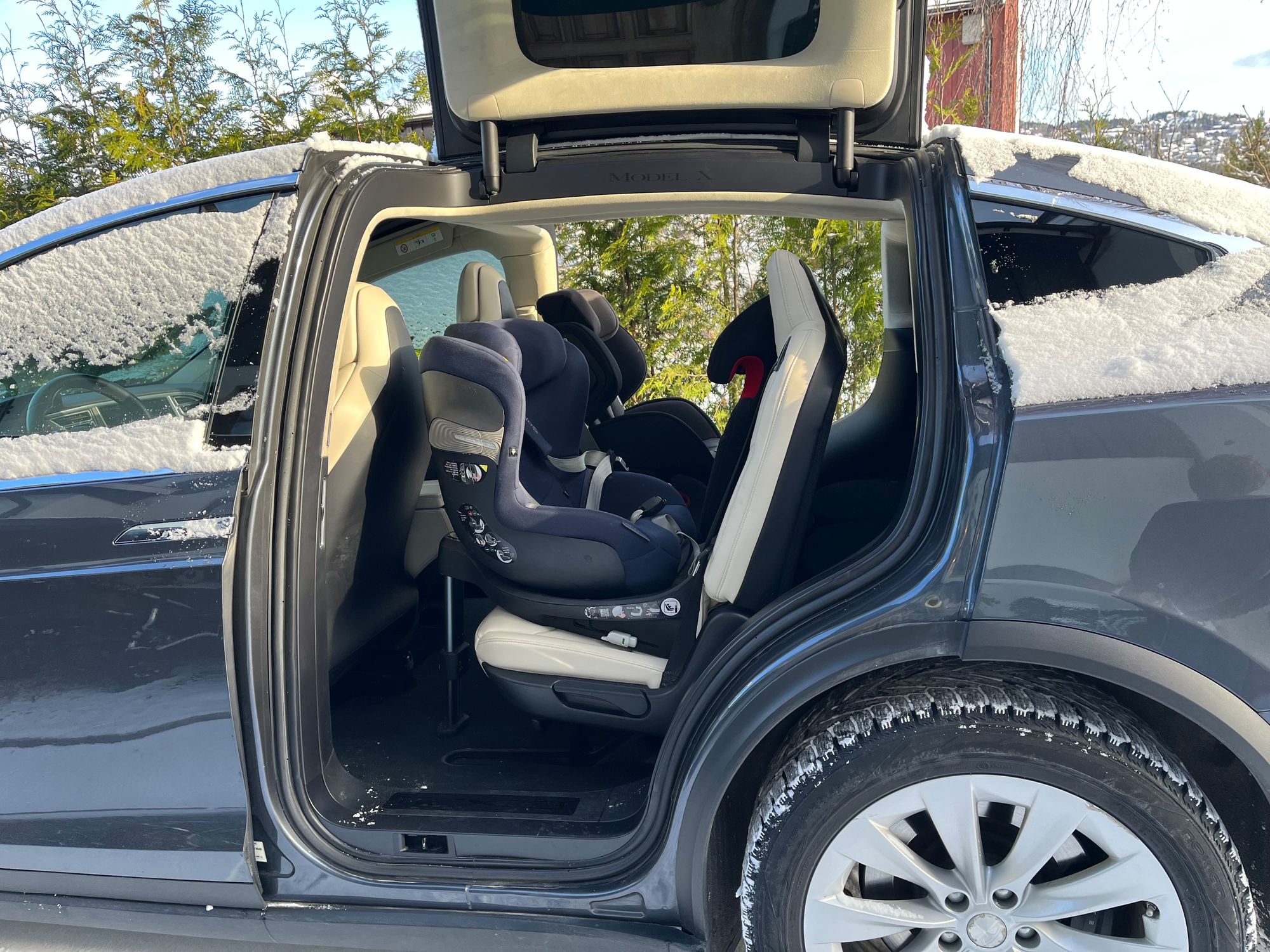 Model X er definitivt en romslig bil som uten problem og med sikkerheten ivaretatt har kapasitet til tre barneseter i baksetet. Den har svært god lastekapasitet i bagasjerommet og rekkevidden holder tilsynelatende helt frem til hytta i Østlandsområdet (mellom 350 og 500 km på vinterføre). I tillegg er vingedørene mer praktisk enn forventet fordi tilgangen i baksetet blir svært god. Alt i alt et veldig godt alternativ for en familie med tre barn!
